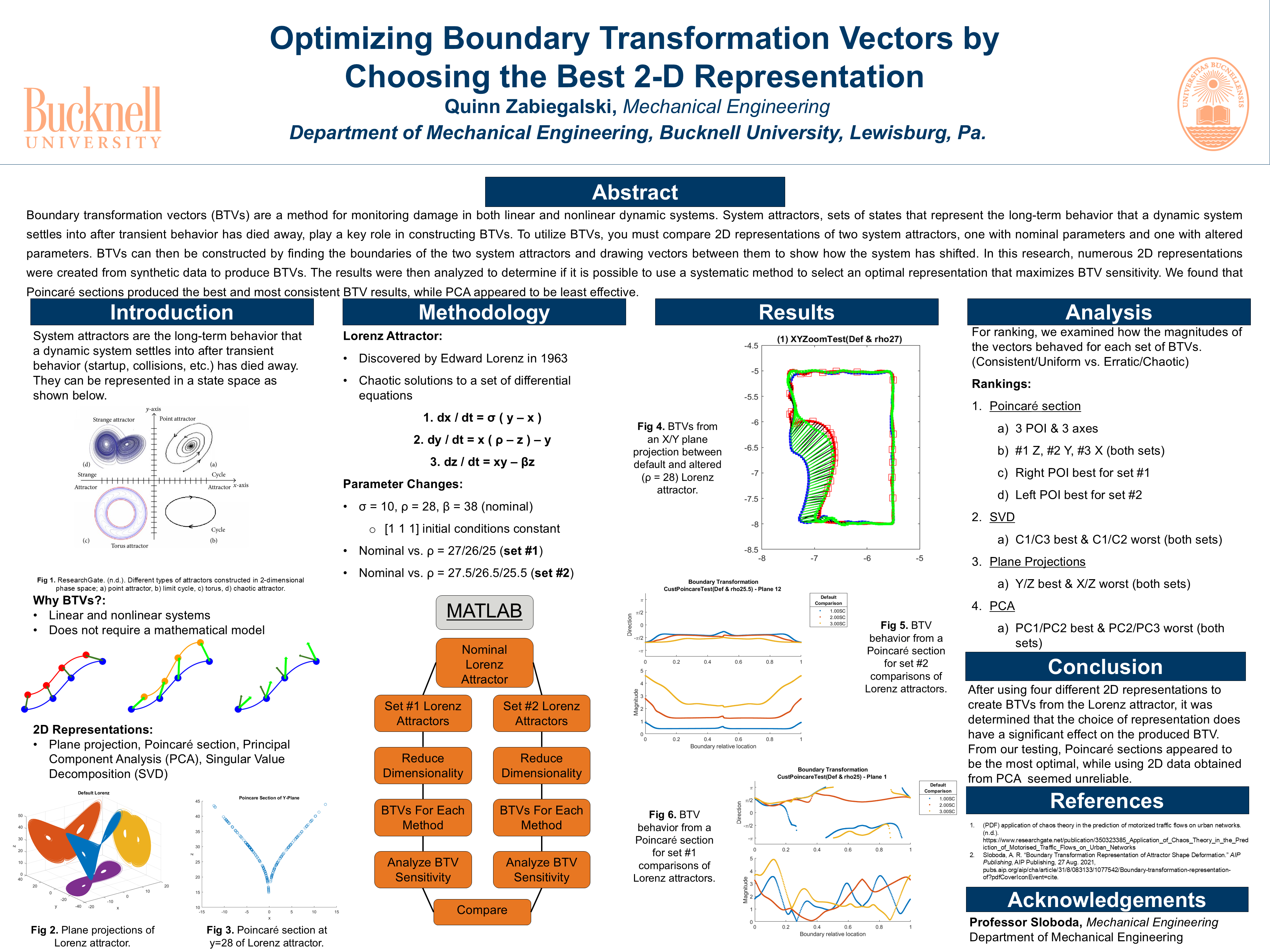 Boundary transformation vectors (BTVs) are a method tailored for analyzing damage in linear and nonlinear dynamic systems. BTVs are constructed by first comparing two system attractors-one representing the system with normal parameters and the other with altered parameters. A system attractor represents the long-term behavior that a dynamic system settles into after transient behavior has dissipated. Utilizing a 2-D representation of the system attractors, BTVs can be created by drawing vectors between the boundaries of the normal and altered attractors to illustrate system changes. The main objectives of this research were to understand the sensitivity of BTVs to different 2D attractor representations and determine an optimal representation method if given a set of data. Initially, literature regarding system attractors and their representations were reviewed. MATLAB was then used to code the four most promising representations for the system attractors, these being plane projections, Poincaré sections, principal component analysis (PCA), and singular value decomposition (SVD). The BTVs were constructed using simulated Lorenz attractor data. After successful implementation of the different representations, two comparison groups were formed. The first group involved altering the rho parameter (ρ) of the Lorenz system from its normal value (ρ = 28) to 27, 26, and 25. The second group used intermediate rho values (27.5, 26.5, and 25.5). Finally, MATLAB functions were used to evaluate the magnitude and direction of the resulting BTVs. Among the methods tested, Poincaré sections yielded the most consistent and effective BTV results, while PCA appeared least effective.