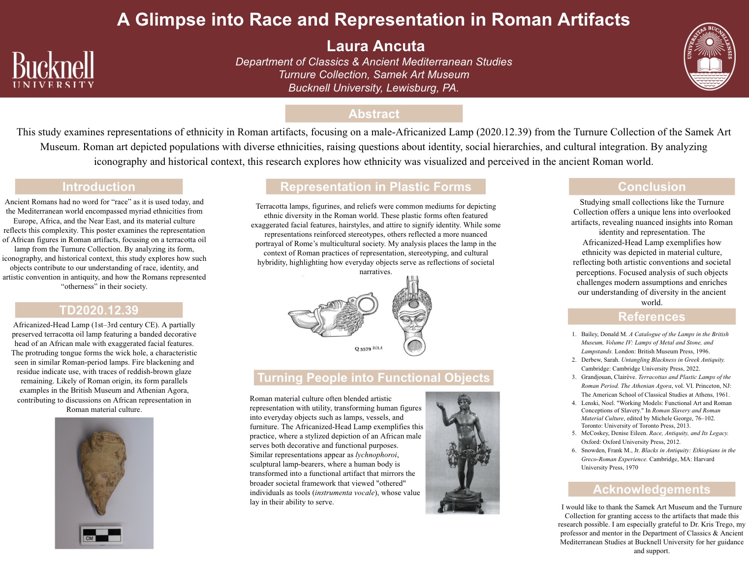 This research presents a Roman terracotta oil lamp, featuring the stylized head of a presumed African male, investigated for its cultural, anthropological, and artistic significance. The lamp, likely produced between the 1st and 3rd centuries CE, was part of a private collection until its recent donation to the Samek Art Museum. Its iconography raises questions about Roman perceptions of identity and otherness, explored through comparative analysis with similar artifacts from the British Museum and other collections. By situating the lamp within the broader cultural milieu of Roman art and material culture, this research examines its role as both a functional object and a symbolic artifact. The analysis places the lamp in the context of Roman practices of representation, stereotyping, and cultural hybridity, highlighting how everyday objects serve as reflections of societal narratives. This research contributes to ongoing discourse on material culture and the artistic expression of identity in antiquity.