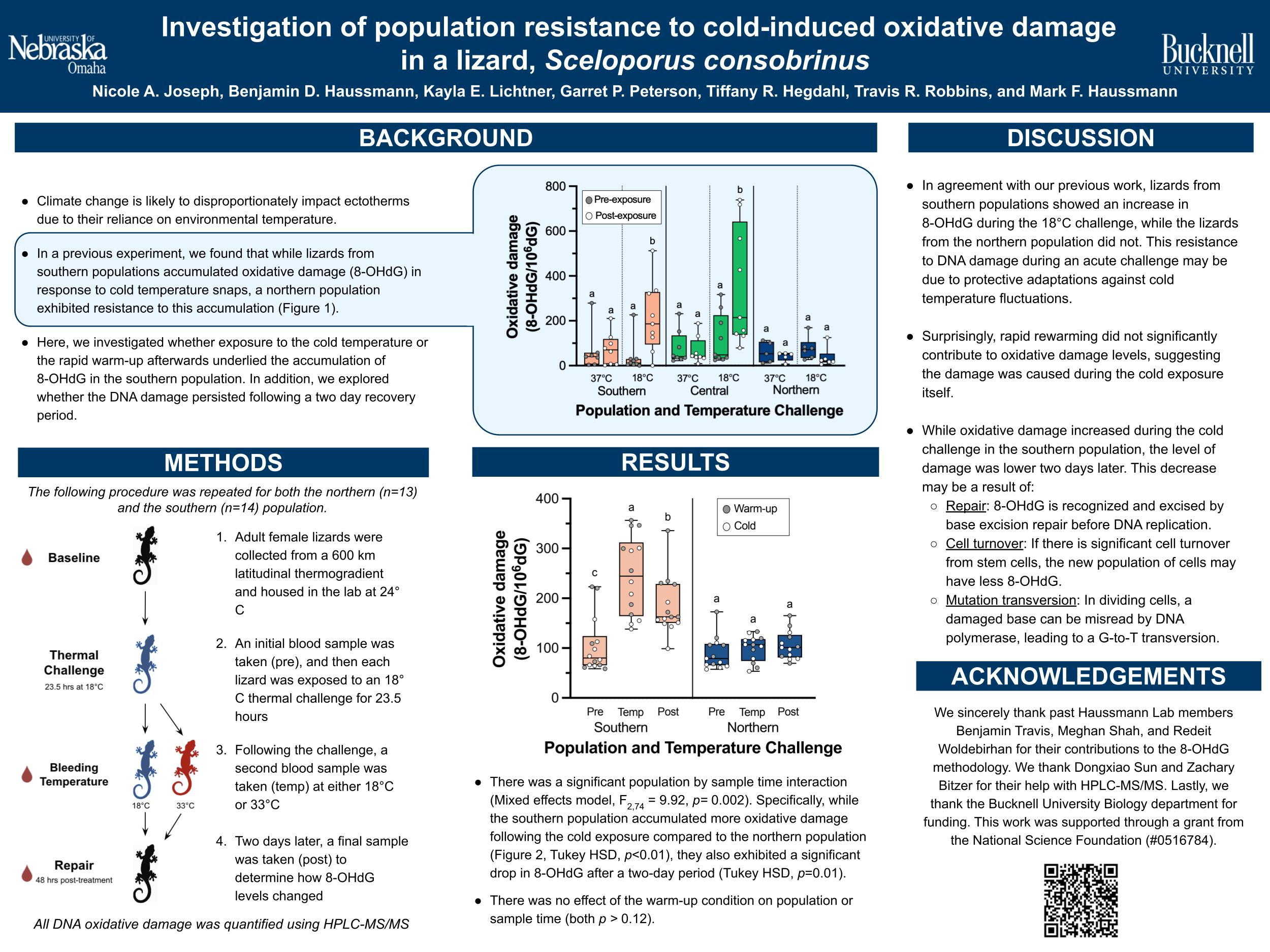 In ectotherms, metabolic rate positively scales with environmental temperature. We previously demonstrated that prairie lizards (Sceloporus consobrinus) exposed to cold temperatures (18°C) showed an expected decrease in metabolic rate in a lab setting. However, these lizards exhibited a statistically significant increase in levels of oxidative damage to DNA, a harmful metabolic byproduct measured as 8-hydroxy-2’-deoxyguanosine (8-OHdG), due to this cold treatment. Interestingly, cold-induced DNA damage differed by population; lizards from the northern-most population, that experience colder annual temperatures, exhibited no increase in 8-OHdG levels. Oxidative damage following cold exposure in southern populations may be due to the cold exposure itself, or to rapid warming up after the exposure. The purpose of this study is to investigate what specifically underlies the cold-induced increase in the 8-OHdG levels. Adult lizards from the northern and southern populations were exposed to a day-long cold temperature challenge (18°C) in the lab. We measured body temperatures for each lizard immediately following the temperature challenge. To determine the effects of rewarming on 8-OHdG levels, we took blood samples from lizards at the 18°C temperature, to act as a control, and lizards that were placed briefly in a warm incubator after the temperature challenge, which served as our experimental treatment group. Finally, we also measured 8-OHdG levels two days after the temperature challenge to examine the DNA damage repair capabilities of each population. As the climate becomes increasingly unpredictable, understanding how ectotherms physiologically respond to temperature changes is essential for predicting their survival and adaptation.